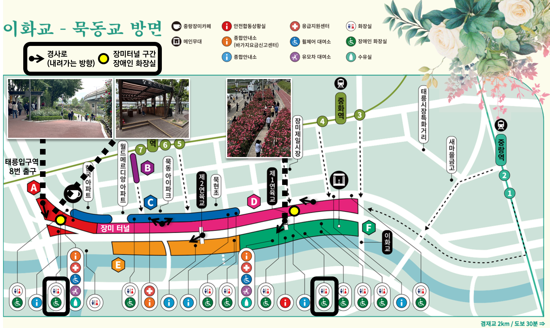 장미터널(D구간)과 중랑천(E,F구간) 보행로는 노면이 평탄하고 경사로가 연결되어 있어 휠체어나 유아차로도 비교적 수월하게 둘러볼 수 있습니다. 다만, 경사로가 다소 가파르고 길어서, 수동휠체어를 사용하는 분은 함께 온 분의 도움이 필요할 수 있습니다.